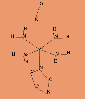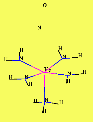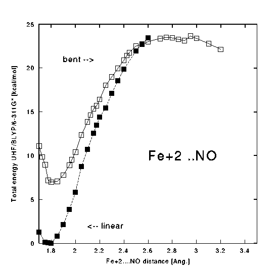 In the case of NO two limiting geometries of Fe-NO unit were studied - the optimized linear and the bent one (Fe-N-O bond angle was 145 deg., N=O bond length was 1.12 Ang.