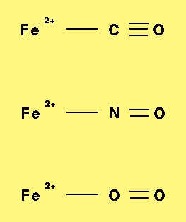 Despite the lack of real dissociation limits in our DFT calculations, one can estimate that the binding energy in the singlet Fe+2-CO is the largest (>65 kcal/mole). This estimate for Fe+2-NO (doublet) is of 24 kcal/mole and for Fe+2-O2 of about 8 kcal/mole). Again, also these numbers are rather crude estimates of real stabilities of ionic models, since no ZPE correction nor BSSE were taken into account, yet.
